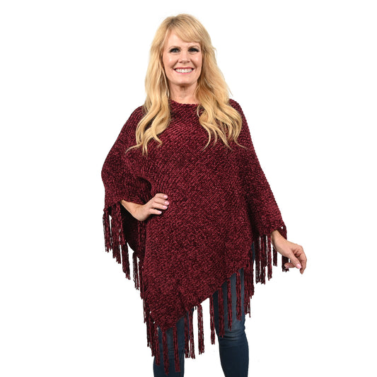 Designer Inspired Perfect Fall Winter Soft Chenille Poncho with Fringe Burgundy L/XL