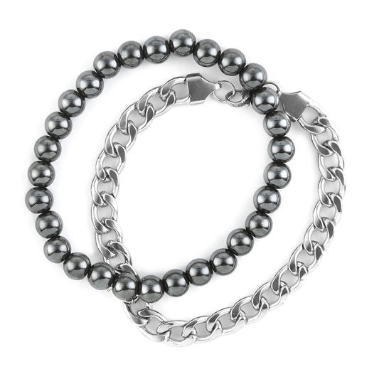 Set of 2 Unisex Hematite Stretch Beaded Bracelet and Curb Chain Bracelets