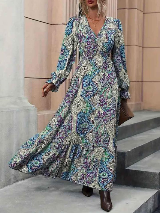 Square Neck, Long Sleeve Floral Print Maxi Dress, Side Slit Size Med NEW