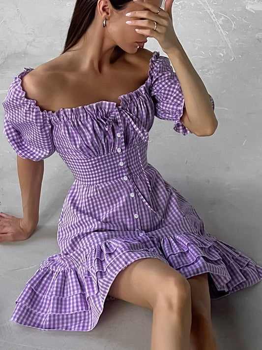 Women's Square Collar Graceful Puff Sleeve Ruffled Dress