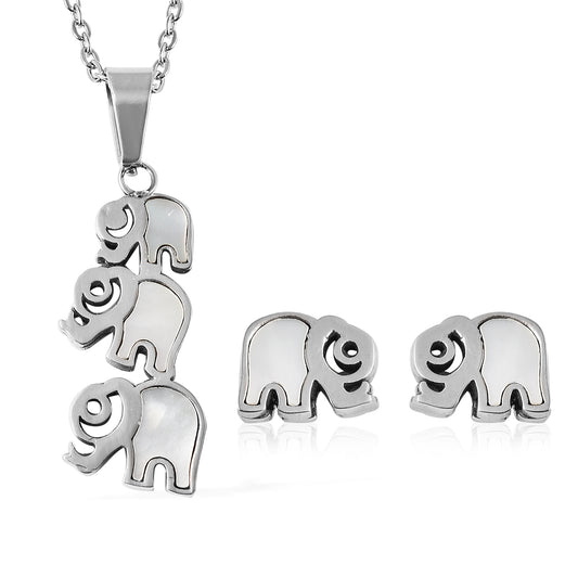 White Mother of Pearl Elephant Stud Earrings and Pendant Necklace