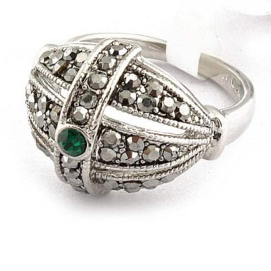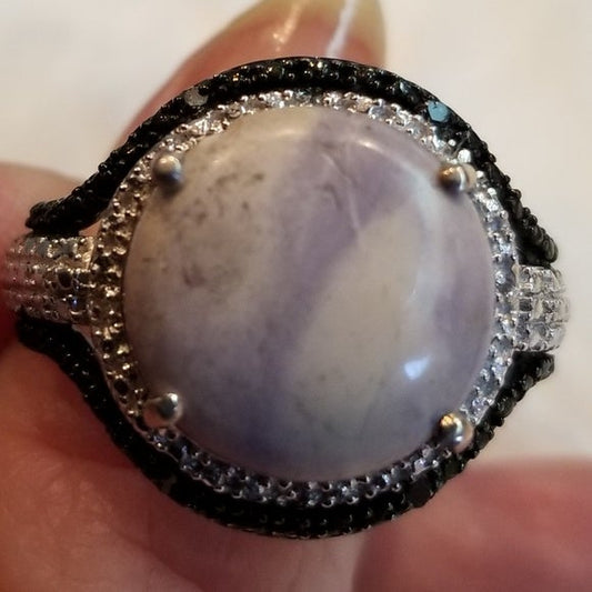 Black Agate and White Austrian Crystal Sterling Silver Ring