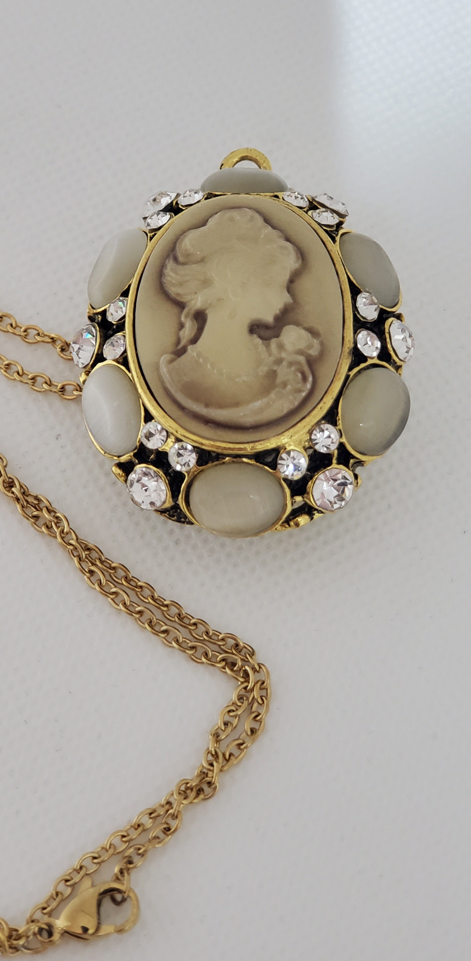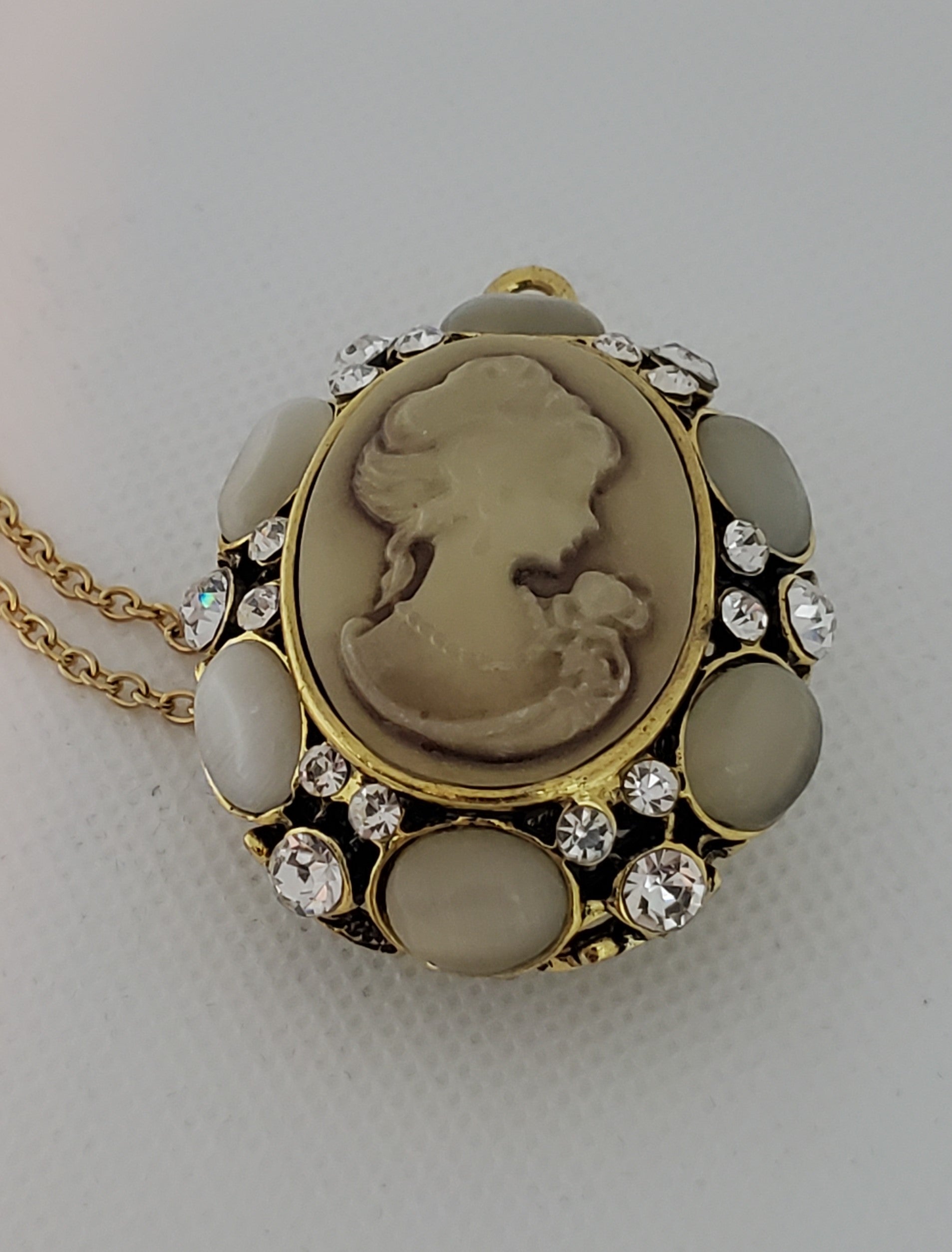 This stunning pendant necklace has the classic cameo look but the open carved backside is almost as pretty as the front.