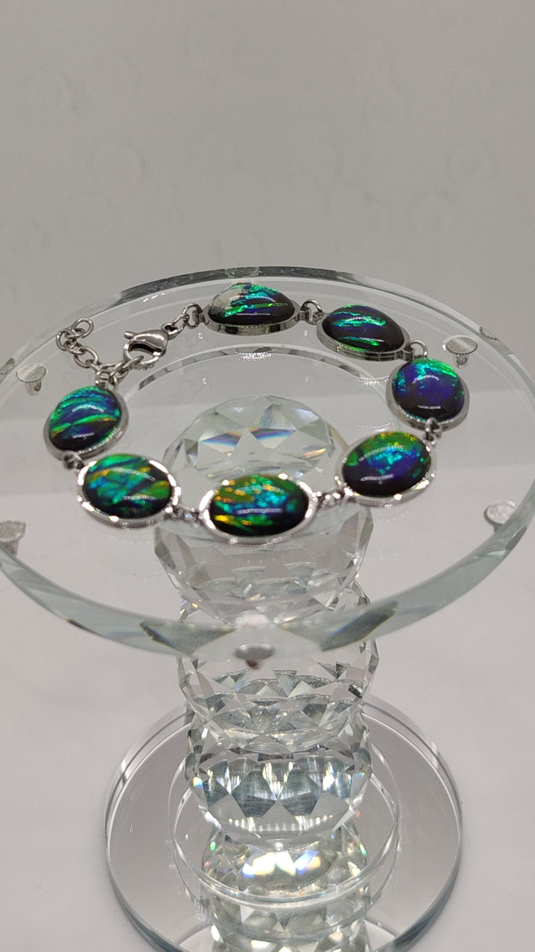 This trendy, brilliantly bright bracelet is sure to catapult your look to the next level. Flashes of hues of blues and greens are mesmerizing.