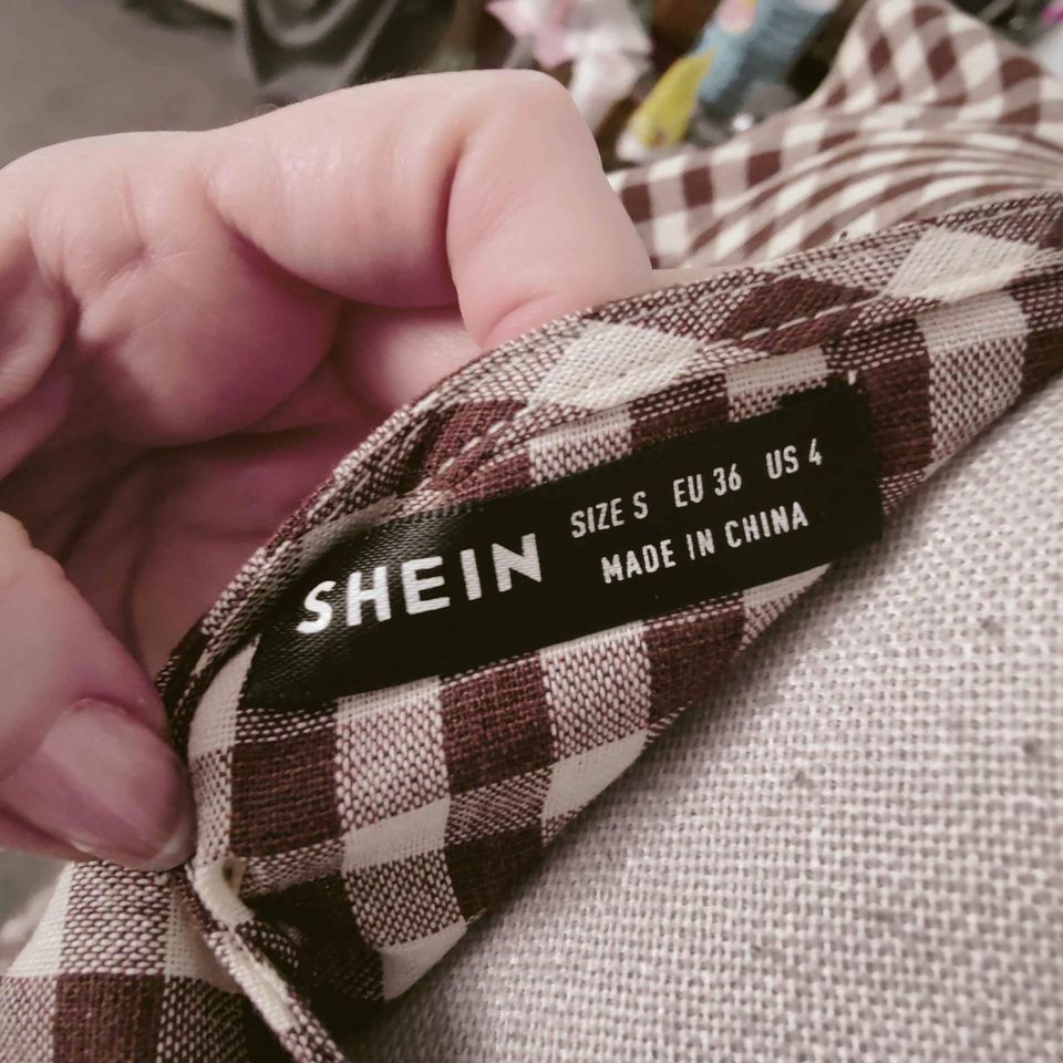 Loose fitting, v-neck, ruffle at shoulder and down front, long sleeves, fits small to medium, brown and cream color