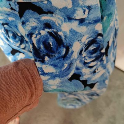 Beautiful fabric, swirling roses in shades of blue and white with a barely black background. Exposed back black zip gives it an eye catching pop!