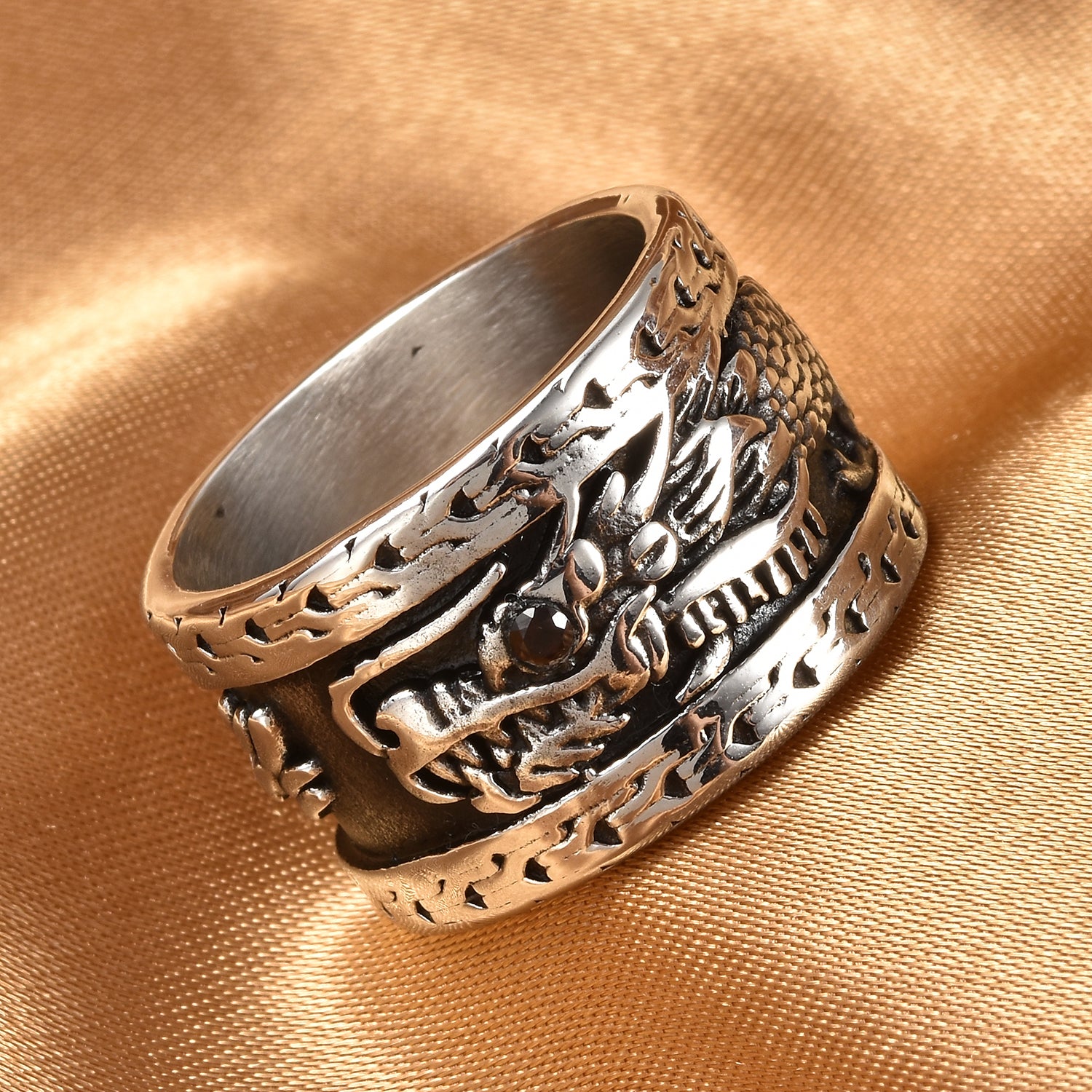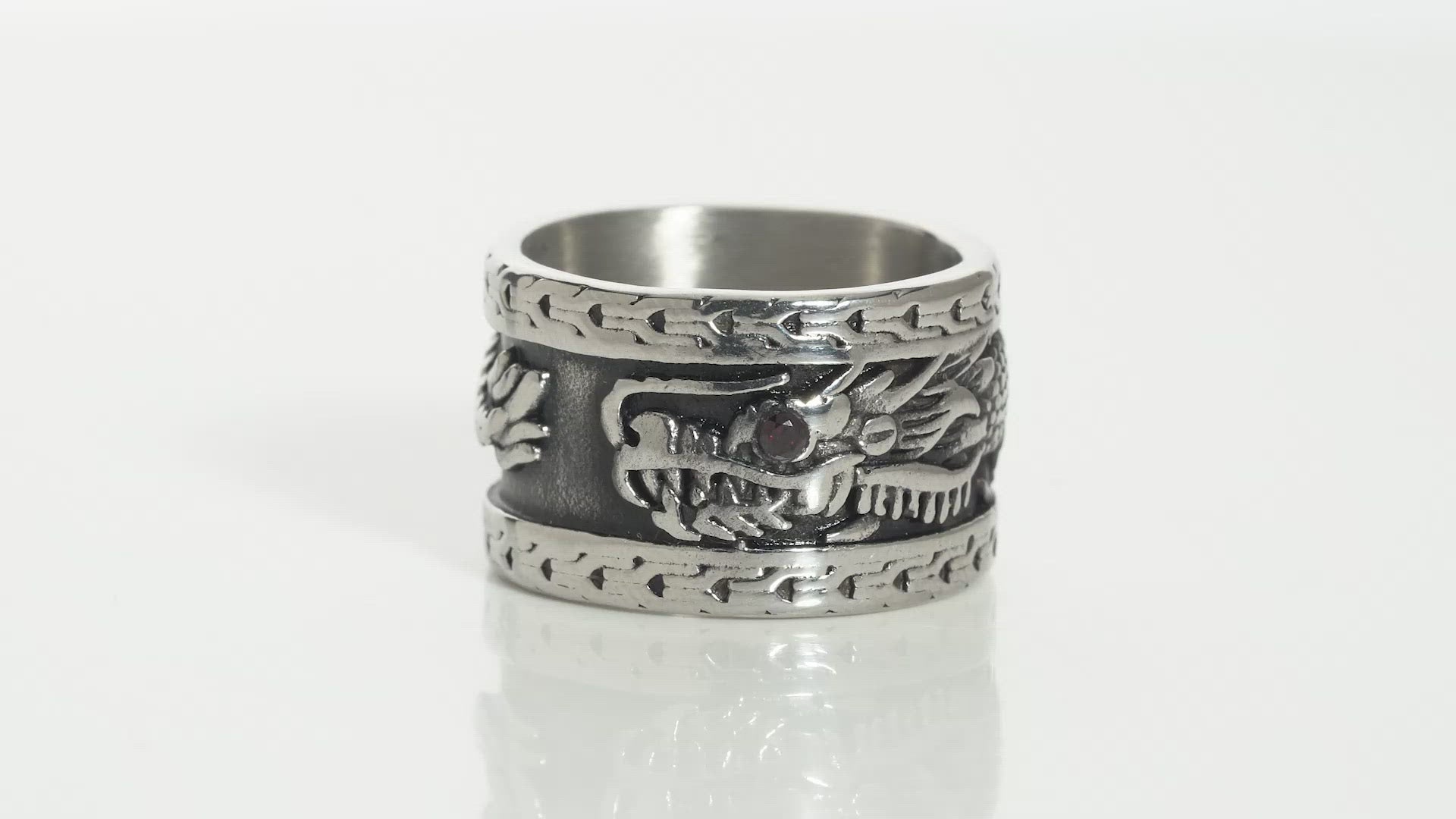 DRAPE THE DRAGON: The round frame features a silver carved dragon on a black background, graciously highlighting the design of this ring