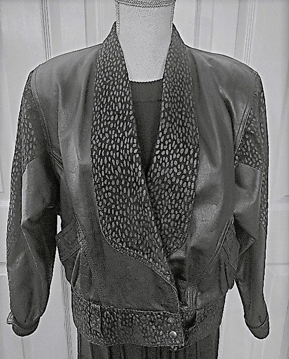Slightly padded shoulders, textured, 2 button bottom closure, pockets.