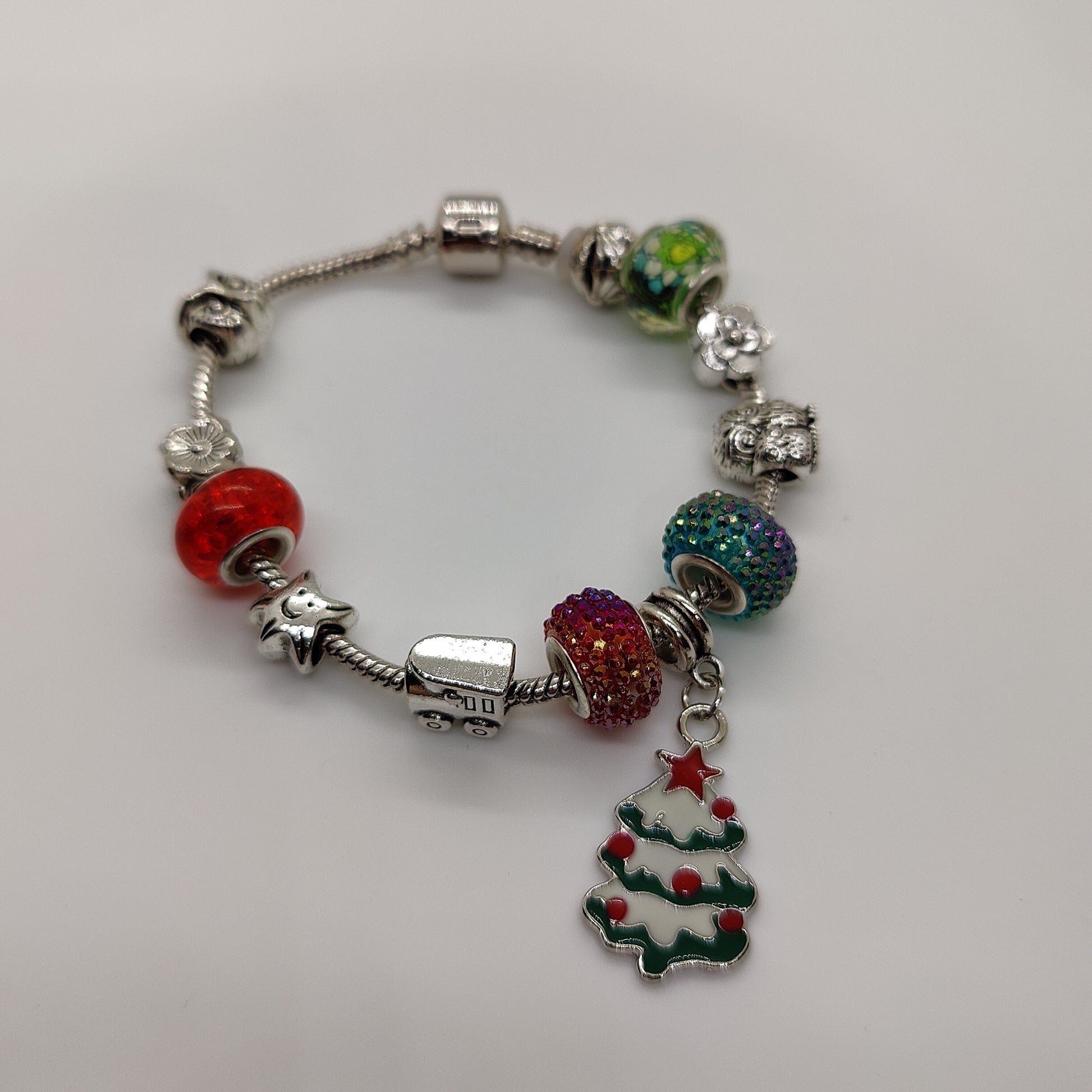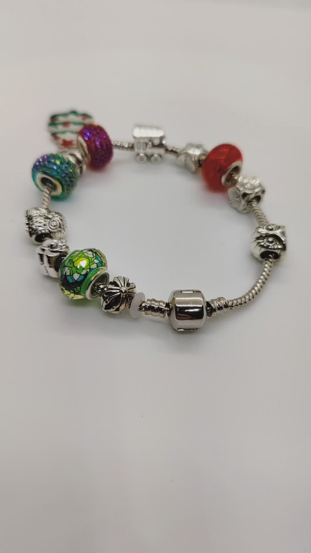 Whimsical Christmas Bracelet - This Christmas Glass Bead Bracelet includes many fun holiday colored glass beads as well as many Christmas charms such as a train, stars & Christmas tree.