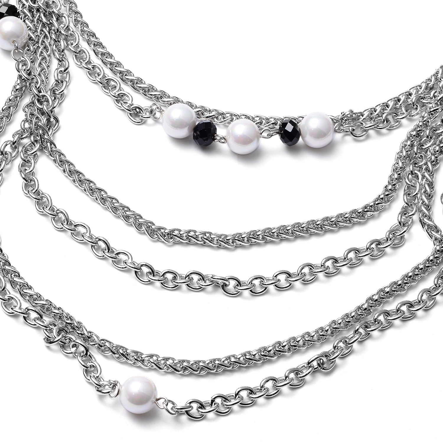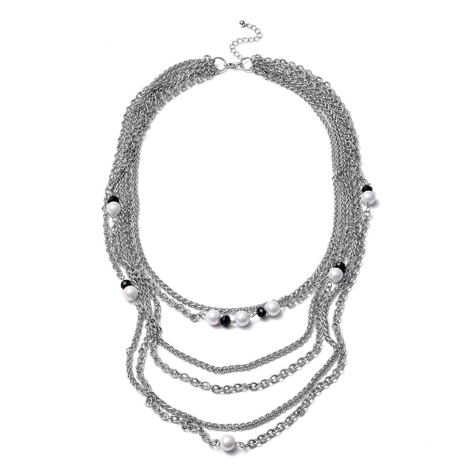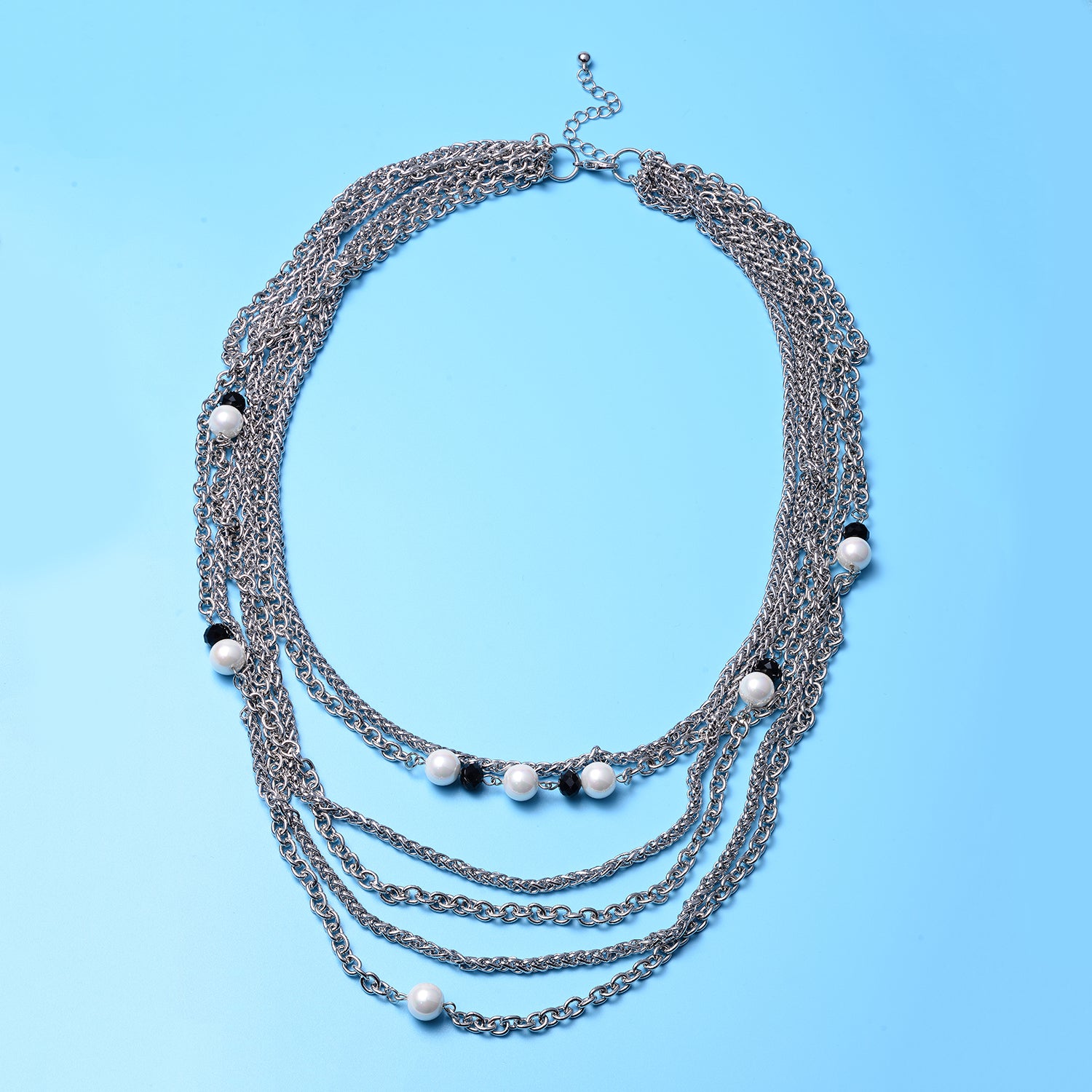 White Pearls and Black Glass Beads enhance this multi strand silver chain necklace.