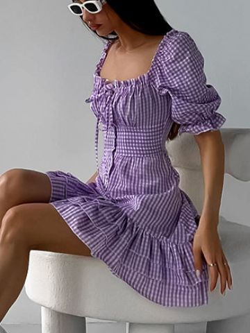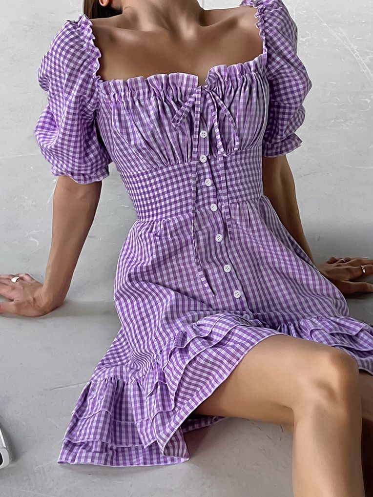 Women's Square Collar Graceful Puff Sleeve Ruffled Dress